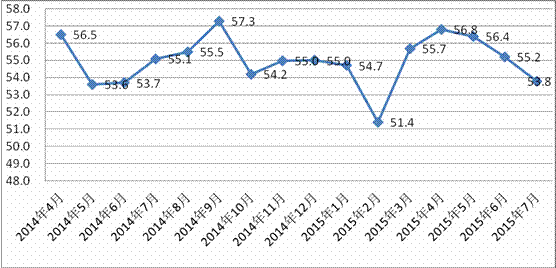 圖 2014年4月-2015年7月物流業景氣指數(LPI)走勢
