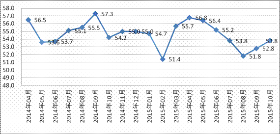 6.資金周轉率指數(shù)高位回落,仍處于較高景氣區(qū)間。10月份,資金周轉率指數(shù)為54.5%,較上月回落3.9個百分點,但仍位于較高景氣區(qū)間。2015年10月24日,央行宣布了降準降息的“雙降”措施,這是今年以來,央行實行了五次的降準和降息,反映出當前經(jīng)濟運行中的資金環(huán)境是較為寬松的。