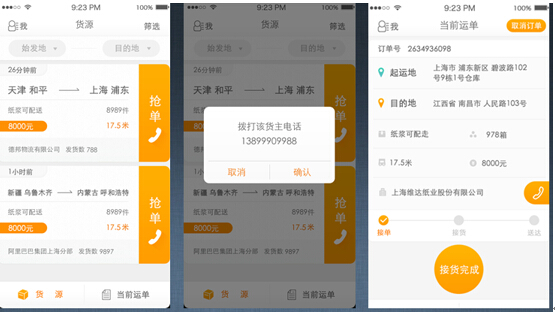 司機通過認證之后就可以登陸到主頁面,只需要在即時更新的貨源信息中篩選合適的貨源,然后點擊“搶單”,即可電話與貨主取得聯系,確認取貨時間、地點、價格。最后選擇接貨完成即可。