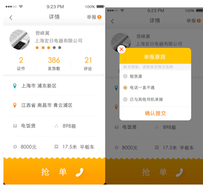 除了以上功能,司機版本還有問題貨源舉報功能,司機發若現問題貨源可直接點擊舉報按鈕,客服核實之后也會對問題賬戶采取相應措施。有了這些歷史數據做基礎,超級貨主平臺也能為貨主和卡車司機提供更為可靠的服務。
