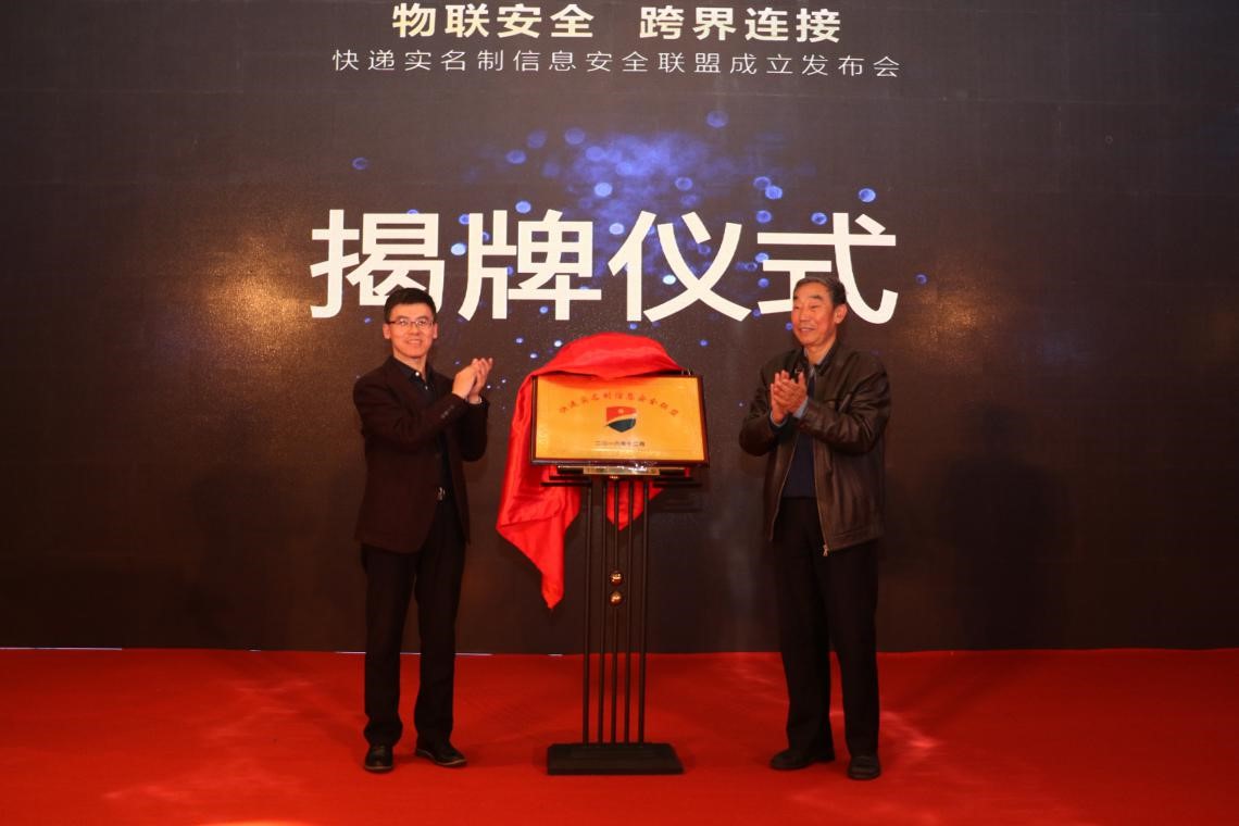 原國家郵政局政策法規司司長,中國快遞協會原副會長兼秘書長達瓦(右) 信息安全聯盟常務副主席李勇虎(左)共同為聯盟揭牌