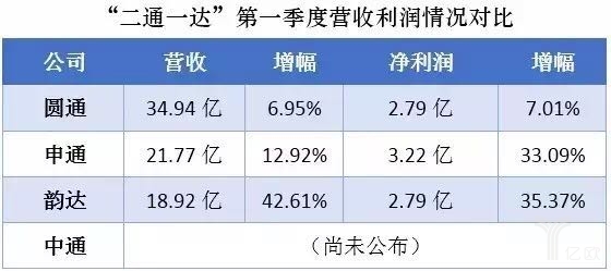 與圓通的低迷形成對比的是韻達,其在一季度的營收增幅和凈利潤增幅均在35%以上,高于圓通和申通,保持著良好的發展態勢。、