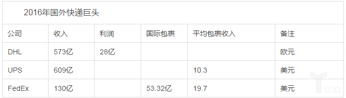 聯邦快遞的財年報告上獲悉,其2016財年營收130億美元,其中快遞業務營收67.15億美元,國際包裹總營收53.32億美元,占據快遞收入的大部分,聯邦快遞每單收入更是高達19.71美元。
