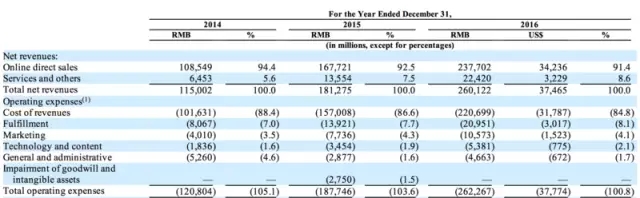 我們以圖中京東2015-2016年的數據為例,其凈營收從1812.75億上漲為2601.22億元,漲幅43.5%。全部的運營支出則從2015年的1877.46億元上漲為2622.67億元,漲幅39.7%。