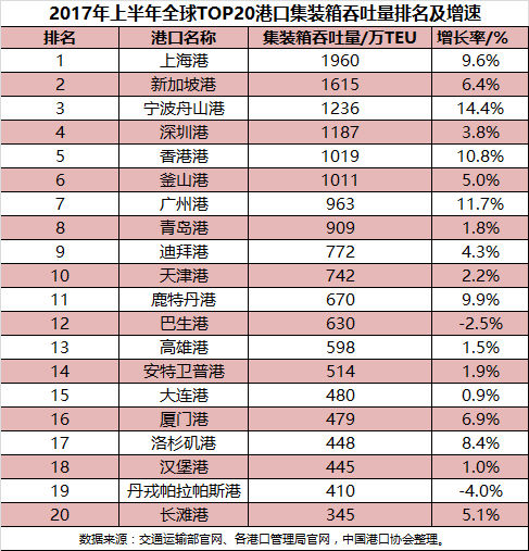 2017年上半年全球TOP20集裝箱港口排名 中國港增速最高