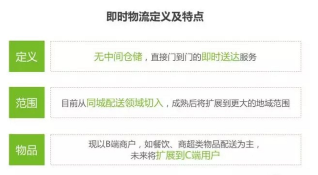 即時物流在餐飲外賣等行業有所涉及。2009年,“即時物流”概念由點我達創始人趙劍鋒提出。2016年8月,點我達接受阿里巴巴近10億元投資,“即時物流”概念廣泛傳播。2016年11月召開的互聯網大會上,美團點評和餓了么相繼強調“即時配送”業務。區別于傳統物流方式,即時物流的核心特點在于即時性,滿足用戶提出的極速、準時的配送要求。目前,即時物流以同城、小件領域切入,拓展到生鮮、商超配送領域,再逐步擴展到更為廣泛的快遞末端領域。