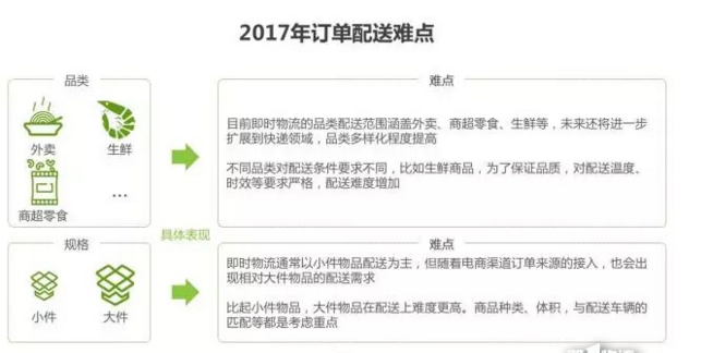 即時物流配送的商品種類日益增多,從最初的外賣,延伸到商超零食、生鮮以及電商快遞領域。不同品類特點的商品對配送要求不同。另外,商品規格的不同也增加了配送難度。