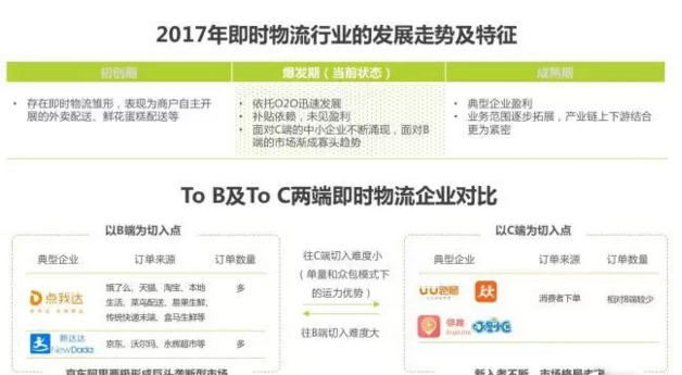 2、即時物流行業在歷經探索期、爆發期、整合期后,形成阿里和京東兩軍對壘局面,點我達、新達達、美團等成為行業主流玩家;