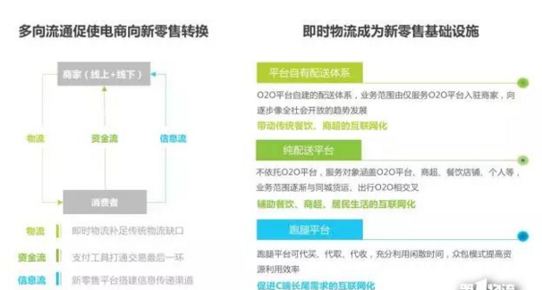 隨著商超宅配的興起和發展,即時物流在外賣配送之外找到了新的市場增長點。目前商超宅配O2O行業滲透率較低,不足2%,但保持50%以上的年增長率,成為即時物流新的增長點。另外,“新零售”概念的提出,將通過數據和商業邏輯的深度結合,實現消費模式的深刻變革,其中物流的價值和重要性日益凸顯。