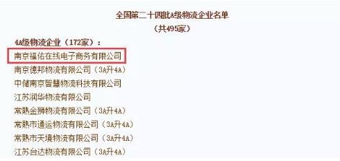 8月22日,中國物流與采購聯合會公布全國第二十四批A級物流企業名單,福佑卡車注冊公司南京福佑在線電子商務有限公司被認定為4A級物流企業。由此,福佑卡車成為全國283家無車承運人試點單位中首批進入國家4A級物流企業名單的試點單位。
