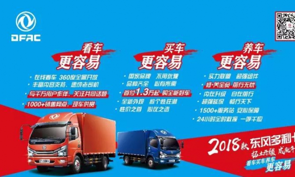 門檻高、成功難,成為現(xiàn)在年輕人通往成功路上的最大攔路虎。東風(fēng)輕型車前瞻性推出“三大更容易”措施,讓年輕卡友成功更容易。看車更容易——微信平臺(tái)在線了解車輛,內(nèi)容豐富支持,速成老司機(jī);與千萬(wàn)用戶作伴,關(guān)注共同話題,緊跟時(shí)代脈絡(luò);超過(guò)1000家銷售網(wǎng)點(diǎn),現(xiàn)車供賞。買車更容易——首付1.3萬(wàn)起,購(gòu)全能好車,經(jīng)典品牌、全新外觀、多種配置、超高性價(jià)比。養(yǎng)車更容易——“修•護(hù)免費(fèi),前行無(wú)憂”,首年4萬(wàn)公里內(nèi)維修全免費(fèi);1500+服務(wù)站,24小時(shí)全時(shí)救援,一呼千應(yīng),安心保障。