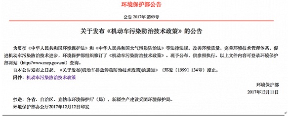 昨天(12月18日),關于發布《機動車污染防治技術政策》的公告在環保部官網做了“亮相”。也就是說,我們這次要談的新政,正是《機動車污染防治技術政策》。
