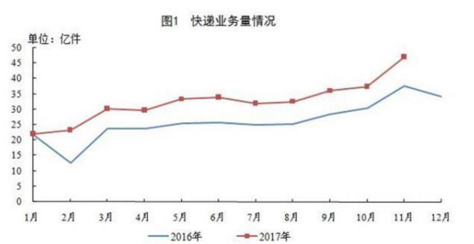 不過,從1-11月的整體數據來看,快遞的業(yè)務量增速維持在25%的增長率,也并不低,快遞行業(yè)仍處于較快速發(fā)展時期,截至11月30日,全國快遞業(yè)務量已累計完成358.6億件,距離400億不到50億件。12月快遞業(yè)務量的增速如果保持在同比增長22%上下,那么2017年全年的業(yè)務量還是很可能突破400億大關,繼續(xù)保持每年增長100億的水平。
