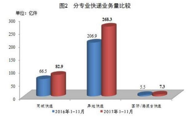 此外,從地域上來看,1-11月,東、中、西部地區(qū)快遞業(yè)務量比重分別為81.1%、11.6%和7.3%,業(yè)務收入比重分別為80.9%、10.8%和8.3%。