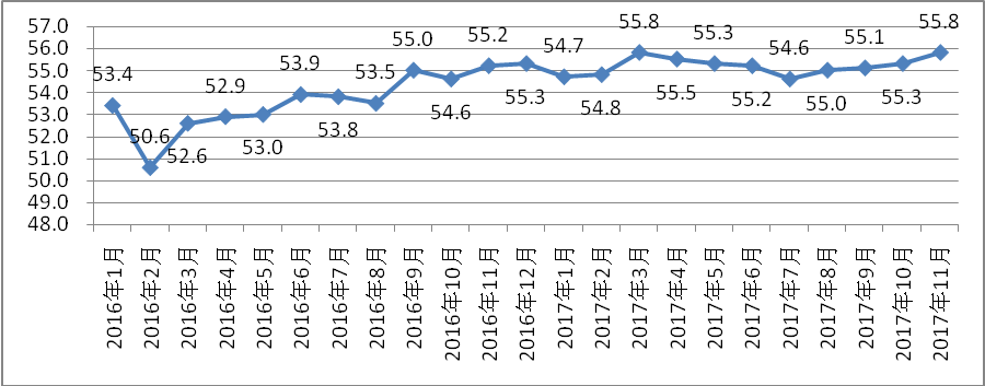 圖 2016年1月-2017年11月福建省物流業(yè)景氣指數(shù)(LPI)走勢圖