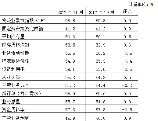 2017年11月份,在國內(nèi)“雙十一”電商促銷活動(dòng)等的帶動(dòng)下,全省物流業(yè)延續(xù)平穩(wěn)較快的增長態(tài)勢,環(huán)比增速有所加快。福建省物流業(yè)景氣指數(shù)(LPI)為55.8%,比上月上升0.5個(gè)百分點(diǎn)。12個(gè)單項(xiàng)指數(shù)“六升一平五降”;其中平均庫存量指數(shù)、庫存周轉(zhuǎn)次數(shù)指數(shù)、從業(yè)人員指數(shù)、新訂單(客戶需求)指數(shù)、業(yè)務(wù)總量指數(shù)、主營業(yè)務(wù)利潤指數(shù)六項(xiàng)指數(shù)均有不同程度上升;固定資產(chǎn)投資完成額指數(shù)與上月持平;其余五項(xiàng)指數(shù)均有不同程度下降。