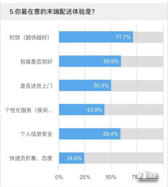 (1)在問卷“你最在意的末端配送體驗”選項中,“個人信息安全”得票率59.4%,僅次于“時效”。