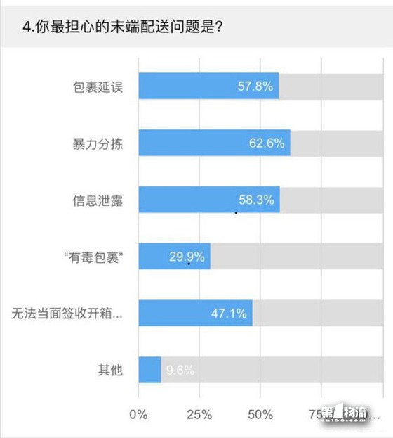 “你最擔心的末端配送問題是?”調(diào)研顯示,消費者對“暴力分揀”和“信息泄露”的擔憂,超過了“包裹延誤”。