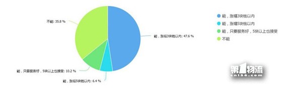 而為了享受更好的服務,64%的受訪者表示可以接受快遞漲價。其中,47.6%的受訪者能接受3塊錢以內(nèi)的漲幅;6.4%的消費者能接受5塊錢以內(nèi)的漲幅;還有10.2%的消費者表示,只要服務好,漲幅5塊錢以上也接受。