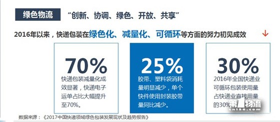 2017雙11是綠色物流的首次集中行動,代表了未來的一種必然趨勢。中國政府在“十三五”期間樹立并貫徹“創(chuàng)新、協(xié)調(diào)、綠色、開放、共享”的發(fā)展理念,綠色物流,已經(jīng)越來越成為物流行業(yè)的共識,無論是小小的包裝耗材,還是整合全社會的平臺搭建,背后都是物流行業(yè)發(fā)展到新階段的內(nèi)生需求。