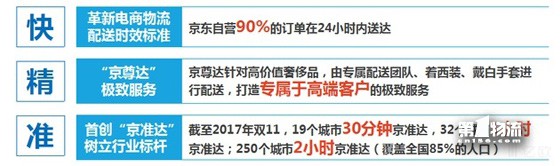 京東物流則正在形成包括211限時達、夜間配、極速達(2小時送達)、京準達(最高精確到30分鐘)、京尊達、生鮮品全程溫控可視在內(nèi)的階梯式、個性化的行業(yè)標準。