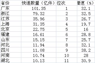 從快遞業(yè)務(wù)數(shù)量來看,有11個(gè)省份的快遞數(shù)量超過了10億件的大關(guān)。其中,第8到第11位的河北、四川、河南和湖北是首次突破10億件大關(guān)。而前7名仍然是廣東、浙江、江蘇、上海、北京、福建和山東,全部是東部沿海發(fā)達(dá)省份。第一財(cái)經(jīng)記者統(tǒng)計(jì)發(fā)現(xiàn),這7個(gè)省份的快遞業(yè)務(wù)綜合超過了302億件,占全國比重達(dá)到了75%。