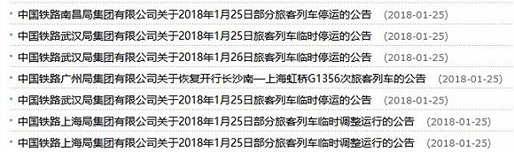 如,中國鐵路武漢局集團有限公司關于2018年1月25日旅客列車臨時停運的公告稱,因雪害影響: