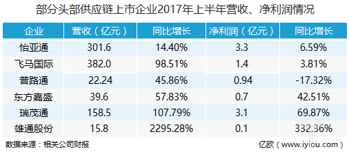 由于國內供應鏈管理行業發展較晚,地區經濟發展不均衡,供應鏈企業發展階段差異較大,未來很長一段時間內,我國供應鏈管理行業仍然處于三個階段并存的狀況。頭部的幾家大型供應鏈企業目前正在急劇進行業務擴張的階段,大部分的企業營收處于高速增長的階段。以2017年的上半年業績數據為例,除怡亞通以外,其他供應鏈企業皆以超過同比40%的營收增長。