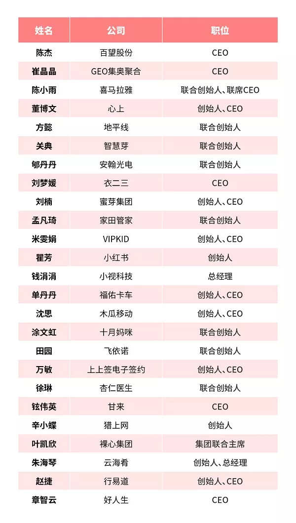 入選該榜單的商界女性還包括VIPKID創(chuàng)始人米雯娟、喜馬拉雅聯(lián)席CEO陳小雨、小紅書(shū)創(chuàng)始人瞿芳、地平線聯(lián)合創(chuàng)始人方懿、衣二三CEO劉夢(mèng)媛、蜜芽集團(tuán)CEO劉楠、云海肴創(chuàng)始人朱海琴等知名女性企業(yè)家和創(chuàng)業(yè)者。該榜單主要依據(jù)商界女性所在企業(yè)的營(yíng)運(yùn)質(zhì)量、成長(zhǎng)潛力以及公眾影響力進(jìn)行綜合判定。