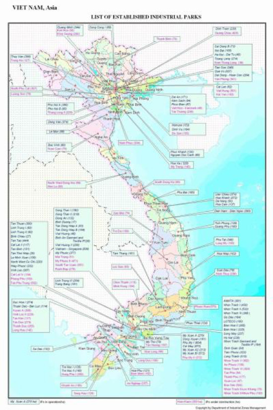 從這張地圖可以看出,越南的工業園區從最北端到南端排成一排。 大多數工業園區都分布著從事不同行業的多樣化企業。