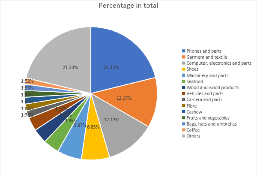 越南出口品類繁多。 依照商品總價值來看,電話、電腦和電子產品,以及服飾鞋履是越南出口最多的商品。(來源:越南統計總局)