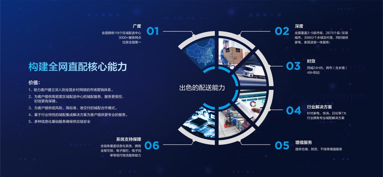 安得全面上線的物流信息系統,在倉配一體化中構建了全網直配的核心能力。截止目前,安得搭建的全網直配網絡布局中包括118個RDC,在全國2875個區縣、39862個鄉鎮內實現無死角輻射,實現城內24H、跨市(含鄉鎮)48H配送的送裝一體化服務,為包括家電、家居等行業客戶提供極具競爭力的倉裝配運一體化等全方位物流服務。
