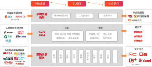 采購業務和數據服務:全物資:直接物料、間接物料、工程與服務;全場景:招投標、詢比價、超市直采;全流程:需求、尋源、合同、執行、發票、支付、評價;全服務;撮合、物流、金融、安全、數據。