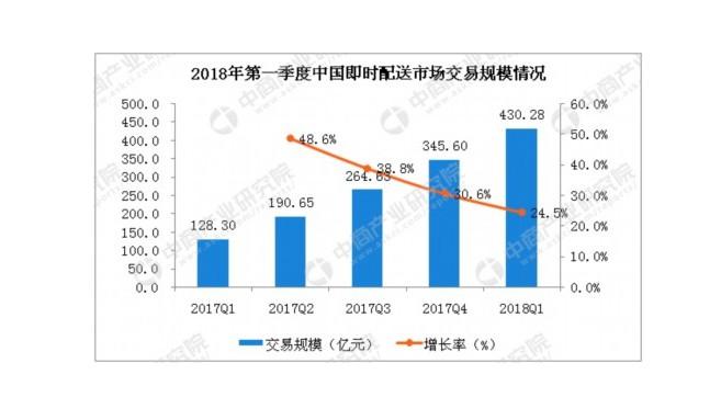 據中商產業研究院《2018-2023年中國即時配送行業市場前景及投資機會研究報告》,報告顯示,在2018年第一季度中國即時配送市場交易規模方面,達到436.28億元,增長24.5%。