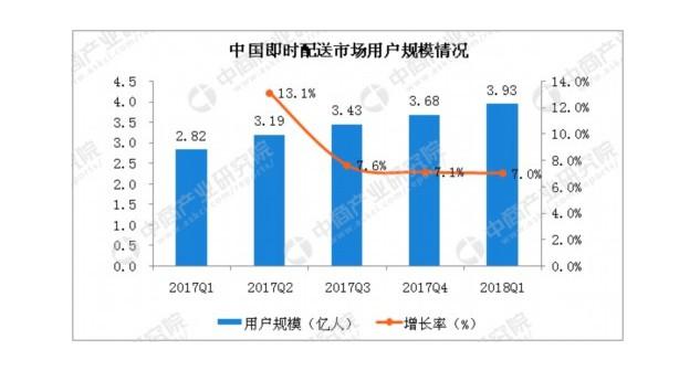 在用戶規模方面,據統計數據顯示,2018年第一季度中國即時配送用戶規模達到3.93億人,增長7.0%,隨著人口紅利的消退,增速將有所放緩,各平臺將服務標準化、系統化作為重點,提升用戶體驗,增強舊用戶粘性和吸引新用戶。