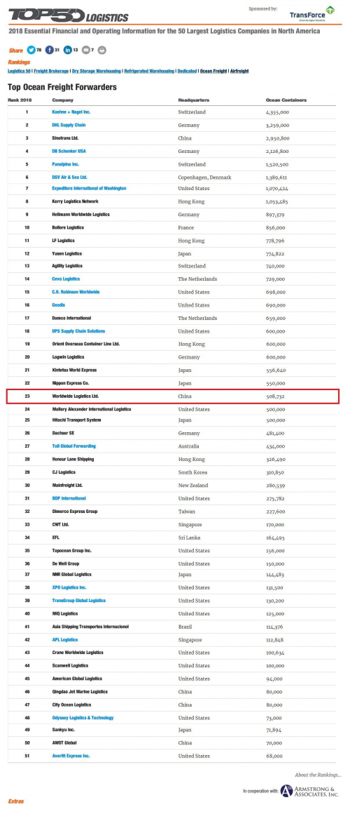 近日,物流業權威雜志《Transport Topics》公布了2018全球貨代50強榜單。瑞士的德迅公司以年處理箱量435.5萬TEU排行第一;德國DHL以年處理箱量325.9萬TEU緊隨其后;中國外運以年處理箱量295.08萬TEU位列中國公司之首,國際排名第三;環世物流以海運集裝箱貨量50.87萬TEU位列中國民營企業之首,國際排名第23位。