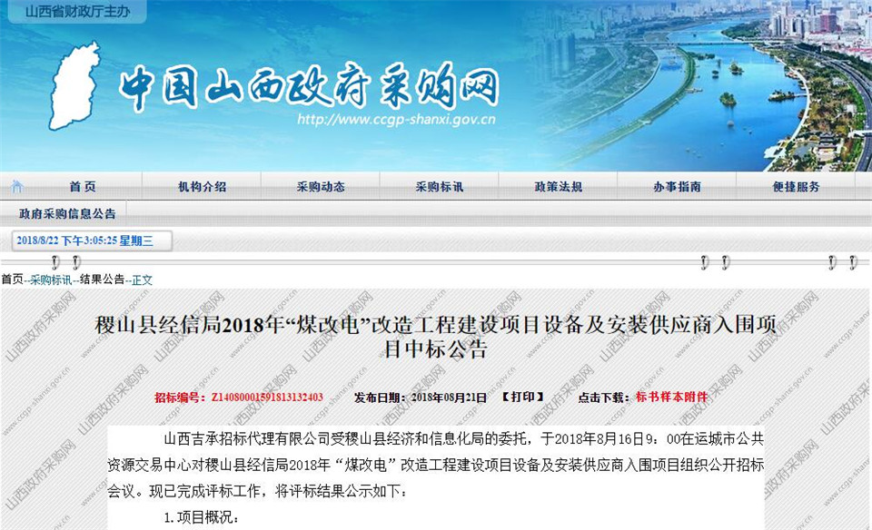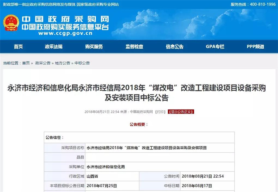 中國政府采購網(wǎng)發(fā)布《永濟市經(jīng)信局2018年“煤改電”改造工程建設(shè)項目設(shè)備采購及安裝項目中標公告》。中國山西政府采購網(wǎng)發(fā)布《稷山縣經(jīng)信局2018年“煤改電”改造工程建設(shè)項目設(shè)備及安裝供應(yīng)商入圍項目中標公告》。