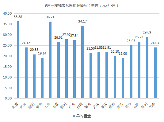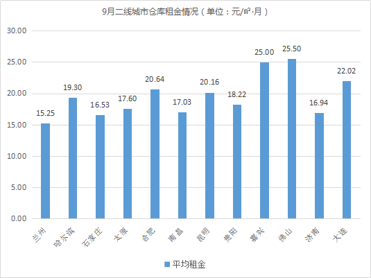 2018年9月,倉庫平均租金最高的城市依然是北京、上海和深圳,平均租金均超過34元/㎡·月,其中,上海和北京租金相比8月均有所上漲。倉庫平均租金最低的城市為蘭州、石家莊和濟(jì)南,平均租金均低于17元/㎡·月,其中,蘭州租金有所下降,主要原因在于,雖然臨近下半年倉庫租賃高峰期,但蘭州并不是主要的物流集散地,倉庫需求并未增加,仍呈現(xiàn)明顯的供大于求的狀態(tài),影響了租金水平。