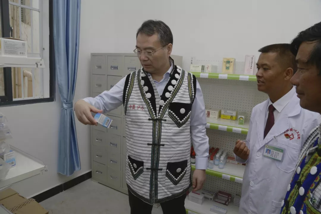 徐冠巨身著當地村民贈送的民族服裝與村民、村醫在安心衛生室交流