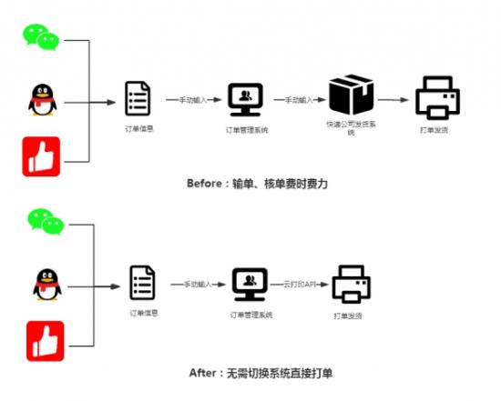 由于訂單和打單系統(tǒng)無法統(tǒng)一,潤熙一開始的發(fā)貨打單流程十分繁瑣。不但需要將微信中的訂單信息手工錄入到自己的管理系統(tǒng)中,而且核單完成后,還得切換到打單軟件,再手動(dòng)錄入一遍信息打印快遞單。“發(fā)螃蟹本身就對(duì)發(fā)貨效率的要求極高,由于人工錄入效率低,沒辦法就得增加人手;還容易出錯(cuò),一旦出錯(cuò),損失就是雙倍。” 因此,將接單,核單,打單環(huán)節(jié)整合到統(tǒng)一的系統(tǒng)中,減少出錯(cuò)率,大大提升發(fā)貨效率,正是潤熙使用快遞100云打印API接口的主要目的之一。