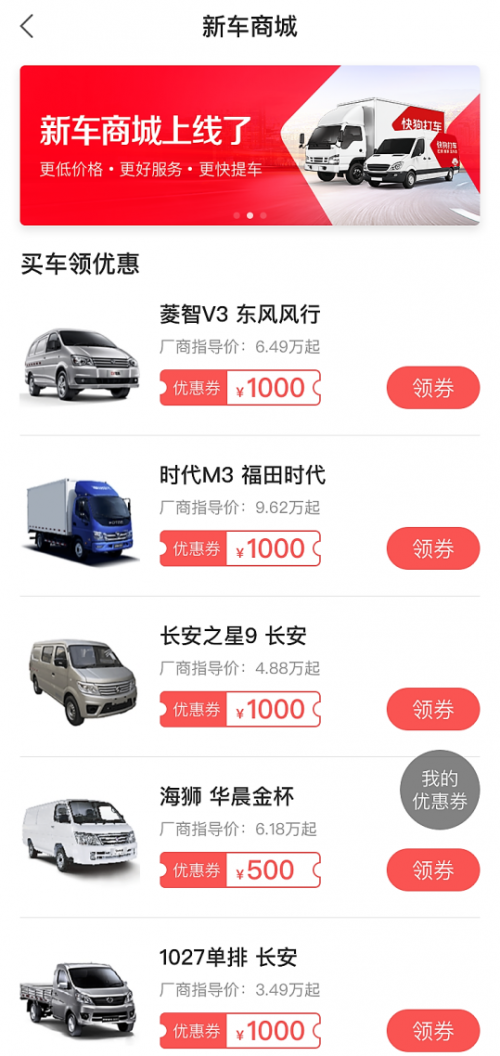 同時,為了更好的服務廣大司機和貨主,為客戶創造更多的價值,快狗打車平臺在最新版的車主端App隆重推出了“新車商城”,購買合作車企的指定車輛,可享受“超低價+優惠券”的超值福利,標志著快狗打車平臺重磅切入合作購車業務。