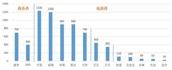 如上圖主要快遞企業(yè)日均件量,順豐達(dá)到700萬件,中通和圓通均超過1200萬件,逐年遞增的業(yè)務(wù)量要求快遞公司必須具備強(qiáng)大的物流處理能力,而這些必須借助自動化設(shè)備的力量來實(shí)現(xiàn)。自動化設(shè)備普及率及程度越高,人效越高,節(jié)省成本也越多。幾大物流公司的實(shí)踐也證明,自動化分揀設(shè)備的引入可以大大提高單人分揀效率,從而降低中轉(zhuǎn)成本,提高整體運(yùn)營效率。