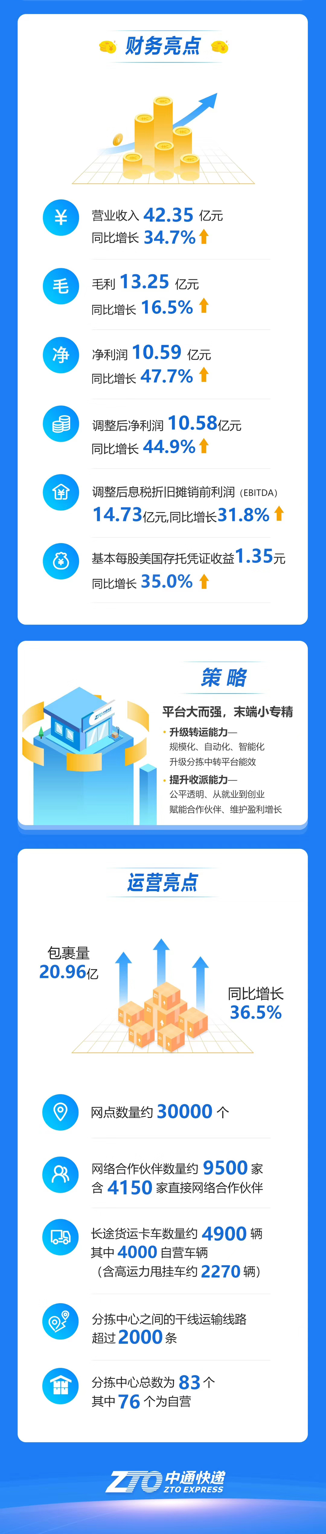 (2)營業收入。中通第三季度營收為人民幣42.35億元,同比增長34.7%。其中,主營業務快遞服務收入增長23.3%。