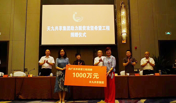 ·2018年,天九共享集團慈善公益再譜新篇。8月向廣元市捐款1000萬元,資助6600位困難學生上學,并向四川蒼溪縣和旺蒼縣捐贈1460萬元,用于醫療扶貧、農業扶貧和敬老扶貧;出資1560萬元,修建感恩堂義診室和鄉親文化中心,并開始啟動義診室直升機急救。此外,為寧夏、新疆、青海、西藏等西部11省區扶貧捐款5000多萬元。盧俊卿表示,2019年天九共享將加大精準扶貧力度,再捐2億元,繼續支持各地工商聯的“萬企幫萬村”公益行動。