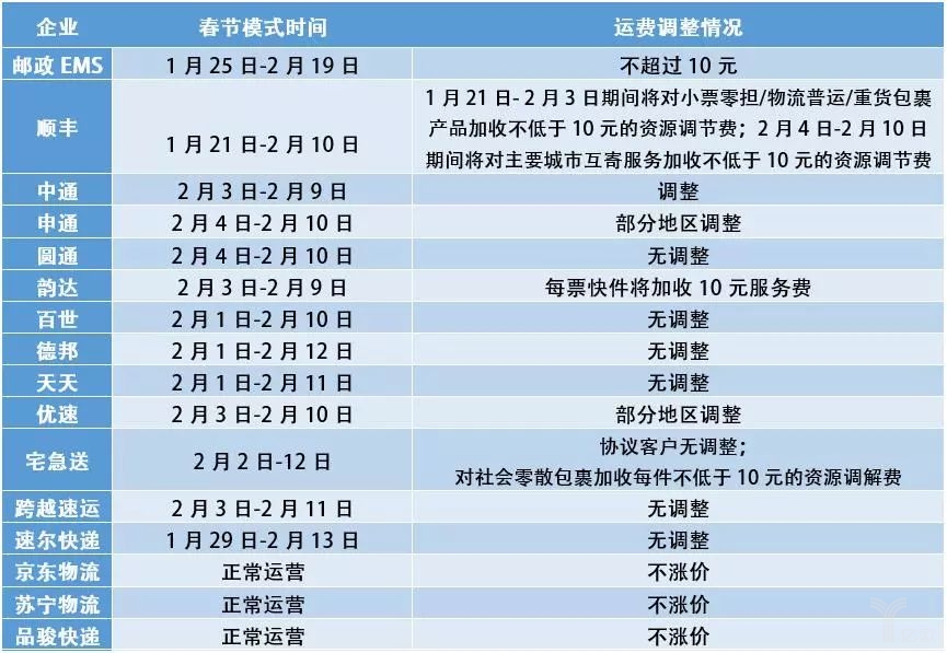 在服務公告中,多家快遞企業(yè)明確提出因成本等因素,快遞服務價格將有一定調整。郵政EMS提出部分區(qū)域的EMS標準快遞每件加收不超過10元的服務費。順豐則表示1月21日-2月3日期間,順豐將對小票零擔、物流普運和重貨包裹產品加收不低于10元的資源調節(jié)費,2月4日-2月10日期間將對主要城市互寄服務加收不低于10元的資源調節(jié)費。韻達和宅急送每票快件將加收10元服務費。此外,中通、申通等快遞企業(yè)與往年相比也提出了調整價格,但未明確調整幅度。
