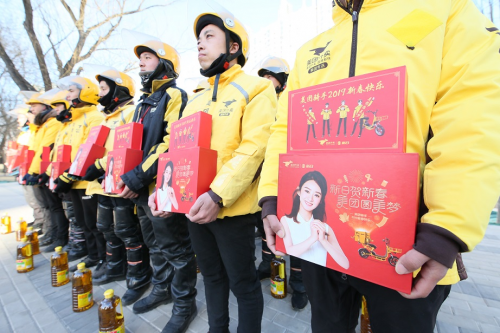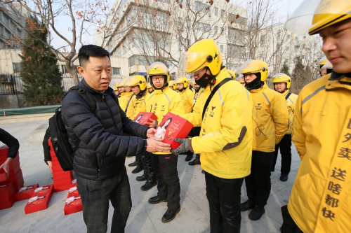 (美團外賣配送事業部總經理魏巍為騎手發放春節禮盒)