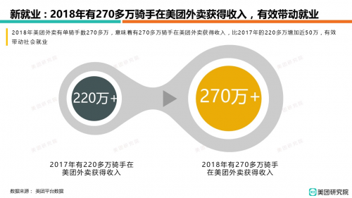 根據美團發布的《城市新青年:2018外賣騎手就業報告》顯示,在2018年共幫助超過270萬騎手獲得收入,其中來自國家級貧困縣的騎手達67萬,覆蓋了全國94%的貧困縣。外賣不僅創造了經濟價值,更創造了社會價值。
