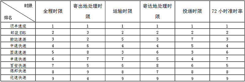 2018年9家快遞服務(wù)品牌主要時(shí)限指標(biāo)排名表現(xiàn)
