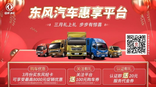 周年狂歡期間,凡是關注“東風汽車惠享平臺”的卡友即可獲得“關注禮”,獲贈100元東風輕卡全系車購車券。而此時進店購車,還可獲得“購車禮”,最高可享受8千元促銷優惠。不僅如此,為了方便各位輕松購車,東風輕卡還推出了“0首付、0利息”的“金融禮”,讓卡友全無后顧之憂,實現輕松購車。總之,這次東風輕卡負責送送送降降降,卡友只需負責購購購就行了。