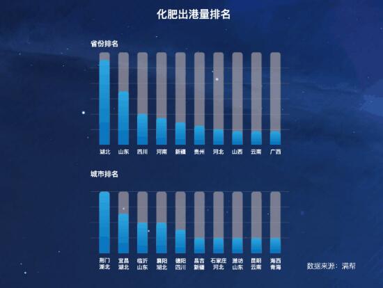 湖北在統計局公布的產量數據和貨運平臺滿幫集團數據中都位居榜首,出港貨運量在平臺化肥總出港量中占比高達22%。荊門、宜昌兩市分列城市出港量前兩位,總占比達13%。